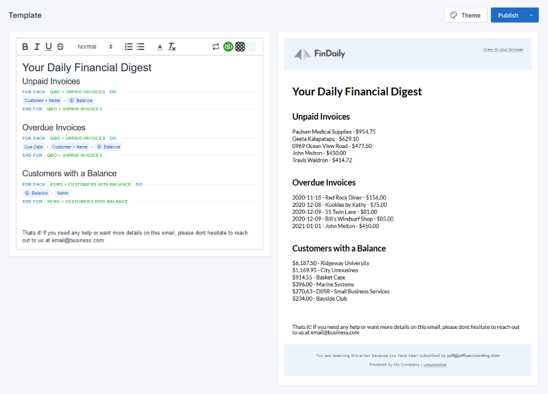 Build your template just as you would a regular email, with a live preview of the output.